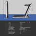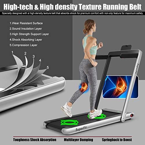 Details: DescriptionOur innovative 2-in-1 folding treadmill has 2 sport modes that can be used as a running treadmill and a under desk walking treadmill. With a powerful 2.25 HP ultra-quiet motor, it provides you with a quiet and comfortable sports environment without disturbing others. 5-layer non-slip and shock-absorbing running belt provides effective cushioning for your back, joints, muscles, knees and ankles. You can connect the treadmill to your phone through Bluetooth and play music while you are exercising. Equipped with a remote control and a safety key for immediate closure in an emergency.Features:The 2-in-1 treadmill can be used as a under desk treadmill and a running treadmillIn the walking mode, the speed of running belt is 1-3mph, while in the running mode, the speed of running belt is 1-8mphMulti-layer shield design and sturdy steel frame make it shock-absorbing and noise-reducingLED display clearly shows time, speed, distance and calories, monitoring your movement data in real timeAdjust running speed with the remote control to reach the intensity best suits youHigh-performance speaker delivers a clear stereo experience by playing music through BluetoothSafety key ensures that the treadmill is stopped immediately in an emergencyBuilt-in transport wheels make it easy to move and storeOut of the box, no installation is requiredIt had passed CE, ROHS, CB, EN957, IEC certifications by SGSSpecifications:Material: ABS Color: Blue/Red/SilverOverall Dimension: 49”x 27”x 42”Folding Dimension: 52”x 27”x 5”Running Area Size: 40" x16"Net Weight: 74 lbsWeigh Capacity: 265 lbsWorking Voltage: AC 110V Peak Motor Power: 2.25HPSpeed: 1-12km/hControl Method: ControllerScreen Display: Time, Speed, Distance, Calorie Package Included:1x 2 in 1 Treadmill1x Remote Control1x Phone Holder1x Safety Key1x Power Cord1x Instruction